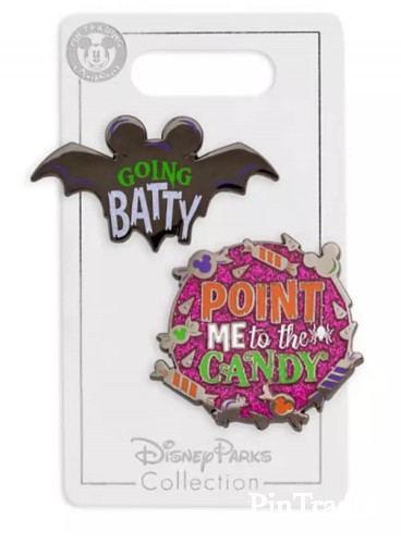 | Description from Shop Disney website (released on 8/12/2019): Halloween Pin Set This Halloween Pin Set will have fans of the eve of All Saints' Day ''Going batty.'' It features two enameled cloisonné pins, one a haunting bat silhouette and the other a sugary sweet design with the directive '' Point me to the candy.'' Magic in the details • Created especially for Walt Disney World Resort and Disneyland Resort • Set includes two pins: ''Going batty'' and ''Point me to the candy'' • Enameled cloisonné • Bat pin features reflective finish • Candy pin features glitter detailing and pewter finish • Mickey icon pinbacks • Comes on Disney Parks Collection card • Part of the Disney Parks Halloween Collection The bare necessities • Metal / enamel • Bat pin: 1'' H x 1 3/4'' W • Candy pin: 1 1/2'' H x 1 1/2'' W • Card: 3 1/2'' H x 2'' W • Imported • Item No. 400021279780 |