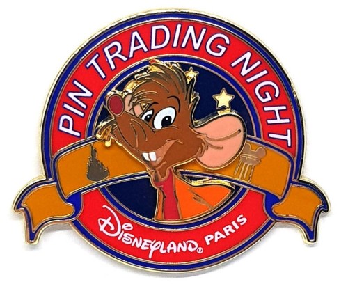 | This pin features Jaq, one of the mouses from the movie Cinderella. PIN TRADING NIGHT is written on the top and Disneyland Resort Paris on the bottom. The moon and the stars on the dark blue background glow in the dark. This pin was released at Hotel Sequoia Lodge on January 25, 2019. There is a red border around the pin which says in white Pin Trading Night and at the bottom is Disneyland Paris. There is a gold banner across the pin which has a small castle on one side and the earful tower on the other. On the dark blue background are glow in the dark crescent moon and stars. |