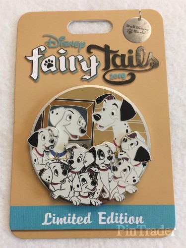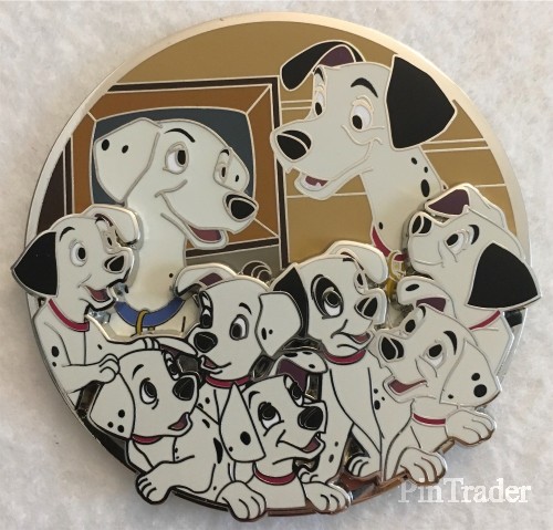 | Item #21 in Pin Celebration Catalog designed by Alex Maher. 2.5" diameter round pin is classified by Disney as mini jumbo. Pin features Perdita, Pongo & Dalmatian puppies. |
