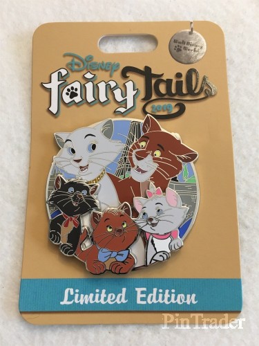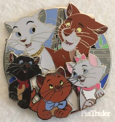 | Item #20 in Pin Celebration Catalog designed by Alex Maher. 2.5" diameter round pin is classified as mini jumbo by Disney. Pin features Duchess, Thomas O'Malley, Berlioz, Toulouse & Marie from the Aristocats. |