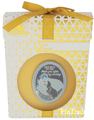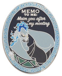 | Oval shaped pin with Hades rubbing his head, with wording "Memo to me: Maim you after my meeting". Pin comes in an ornate gift box, with a gold colored ribbon |