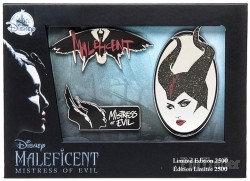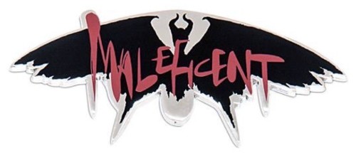 | A silhouette of Maleficent from her front, showing her full body and wings, which are spread out. The word "Maleficent" is in red. |