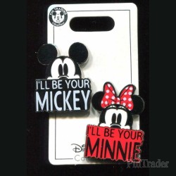| Description from Shop Disney: Follow in Minnie and Mickey's footsteps and share your fondness for your special someone with this set of two pins, featuring the timeless lovebirds proclaiming their tender devotion to one another. Magic in the details Created especially for Walt Disney World Resort and Disneyland Resort • Set of two enameled cloisonne pins • Includes Mickey and Minnie Mouse • Mickey: ''I'll Be Your Mickey'' • Minnie: ''I'll Be Your Minnie'' • Goldtone finish • Mickey icon pinbacks • Comes on card The bare necessities • Metal / enamel • 1 2/3'' H x 1 1/4'' W x 2/5'' L • Imported |
