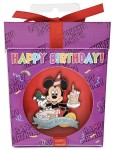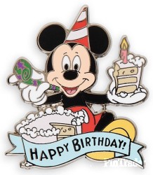 | This open edition pin features the words "Happy Birthday" on it. It shows Mickey Mouse celebrating with a birthday cake |