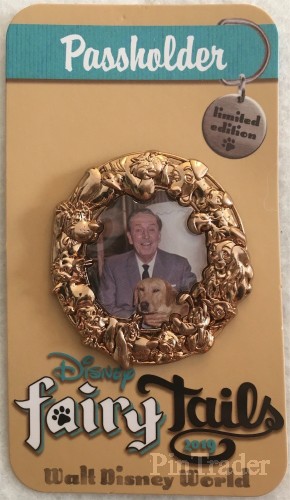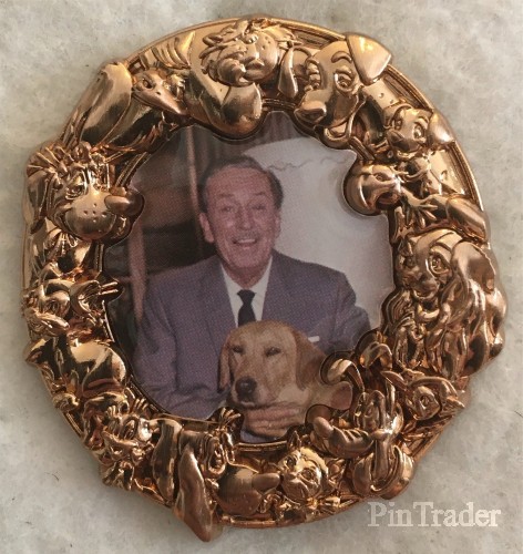 | Item #1 in Pin Celebration Catalog designed by Alex Maher. Pin features printed insert Walt Disney with his dog framed by Disney animal characters as in 3D sculpted metal. Pin dimension are 1.75"w x 1.75"h. |
