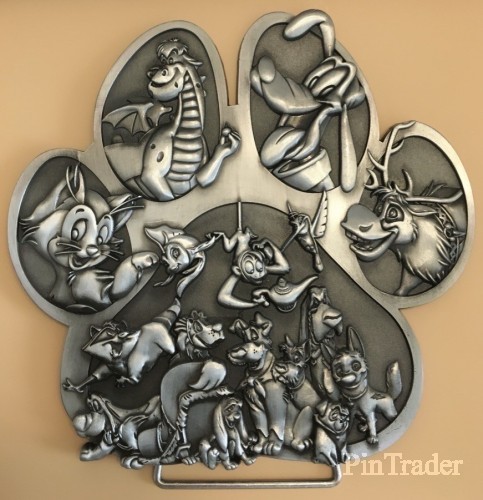 | Item #23 in Pin Celebration Catalog designed by Randy Noble. Super Jumbo pin is 6"w x 6"h and has a stand on back. Pin is 3D sculpted metal and features the many of Disney character animals. |