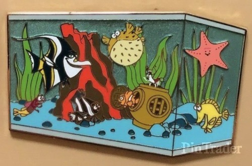 | Item #11 in Pin Celebration Catalog designed by Randy Noble. Pin features Nemo & his fish tank friends from Pixar's Finding Nemo, flat on level, screen print & translucent fill. Dimensions 2.5"w x 1.51"h. |