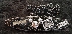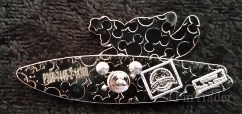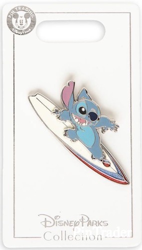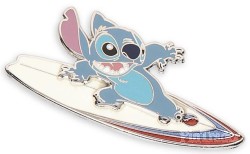 | This open edition pin features Stitch riding a surfboard. Stitch is a pin on pin element and there is glitter fill on the surfboard. |