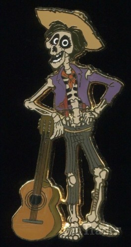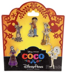 | Open Edition 5 Pin set depicting Characters from Disney/Pixar’s Coco. Pins are enameled cloisonné. Pins are outlined in gold with gold backing. Pin backs have traditional waffle pattern. |