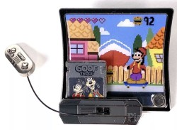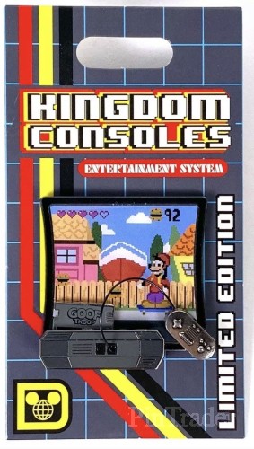| Pin features Max on a skateboard with Max and Goofy on the cartridge The game cartridge moves up. • Pin of the Month • Eighth (#8) in the series • Vintage-looking video-game console and television (TV) |
