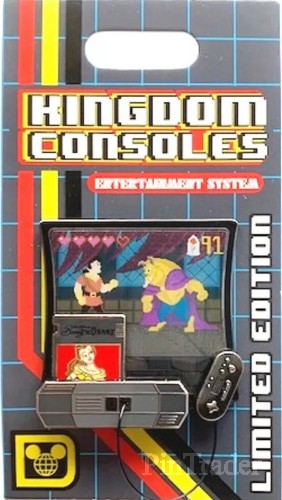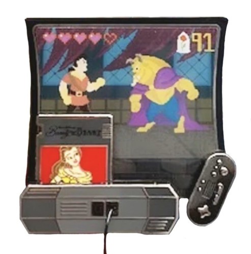 | Pin features Gaston and Beast on the video game. The game cartridge moves up. • Pin of the Month • Twelfth (#12) in the series • Vintage-looking video-game console and television (TV) |
