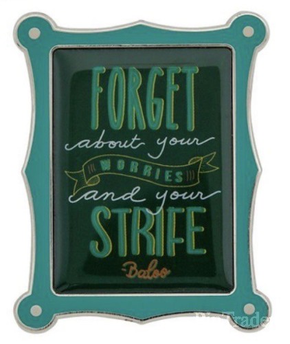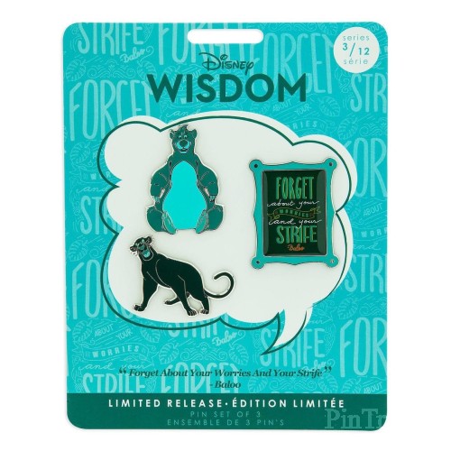 | Baloo Quote is “Forget about your worries and your strife'' Description from Shop Disney: Item No. 6505057584581P Baloo and Bagheera make wise in this collectible pin set sharing advice gleaned from the bare necessities of life. Celebrate timeless Disney Wisdom with this The Jungle Book limited release in our monthly special edition pin collection. Magic in the details • Please note: Purchase of this item is limited to 1 per Household. • Limited release • Set includes three enameled cloisonne pins • Pins feature Baloo, Bagheera, and quote ''Forget about your worries and your strife'' • Gleaming silvertone finish • Mickey icon pinbacks • ''Disney Pin Trading 2019'' and ''Disney Wisdom'' logo on back • Comes on commemorative card • Third in a series of 12 monthly collectible pin sets • Inspired by Walt Disney's The Jungle Book (1967) • Part of the Disney Wisdom Collection The bare necessities • Metal / enamel • Up to 2'' H • Imported |