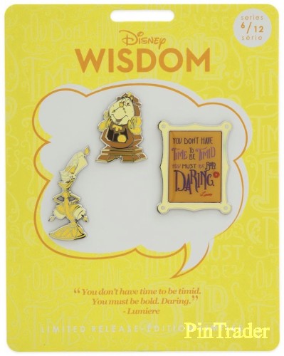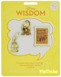 | Description from Shop Disney: Item No. 6505057584732P Cogsworth joins Lumiere and the candelabra's wise words on this collectible three-piece pin set. Celebrate timeless Disney Wisdom with this Beauty and the Beast limited release as the June entry in our monthly special edition pin collection. Magic in the details • Please Note: Purchase of this item is limited to 1 per household. • Limited Release • Set includes three enameled cloisonné pins • Pins feature Lumiere, Cogsworth, and quote ''You don't have time to be timid, you must be bold. Daring. - Lumiere'' • Gleaming goldtone finish • Mickey icon pinbacks • ''Disney Pin Trading 2019'' and ''Disney Wisdom'' logo on back • Comes on commemorative card • Sixth in a series of 12 monthly collectible pin sets • Inspired by Beauty and the Beast (1991) • Part of the Disney Wisdom Collection The bare necessities • Metal / enamel • Up to 2'' H • Imported |