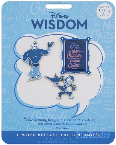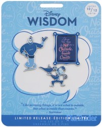 | The quote says: “Like so many things, it's not what is outside, but what is inside that counts - Narrator” Description from Shop Disney website: Genie and Abu appear as if by magic in this collectible pin set sharing advice from the Narrator of Aladdin, ''...It's not what is on the outside, but what is on the inside that counts.'' Celebrate timeless Disney Wisdom with this limited release from our monthly pin collection. Magic in the details • Limited Release • Set includes three enameled cloisonné pins • Pins feature Genie, Abu, and Narrator quote: ''Like so many things, it's not what is on the outside, but what is on the inside that counts.'' • Gleaming silvertone finish • Mickey icon pinbacks • ''Disney Pin Trading 2019'' and ''Disney Wisdom'' logo on back • Comes on commemorative card • Tenth in a series of 12 monthly collectible pin sets • Inspired by Disney's Aladdin (1992) • Part of the Disney Wisdom Collection The bare necessities • Metal / enamel • Up to 2'' H • Imported Item No. 465053478617 FAC-046730-9156 |