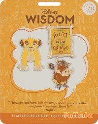 | Description from Shop Disney website: ''The past can hurt. But the way I see it, you can either run from it or learn from it,'' Rafiki advises Simba in The Lion King and as part of a three-pin set. Celebrate timeless Disney Wisdom with this limited release from our monthly pin collection. Magic in the details • Limited Release • Set includes three enameled cloisonné pins • Pins feature Simba, Pumbaa, and a Rafiki quote: ''The past can hurt. But the way I see it, you can either run from it or learn from it.'' • Gleaming silvertone finish • Mickey icon pinbacks • ''Disney Pin Trading 2019'' and ''Disney Wisdom'' logo on back • Comes on commemorative card • Eleventh in a series of 12 monthly collectible pin sets • Inspired by Disney's The Lion King (1994) Part of the Disney Wisdom Collection The bare necessities • Metal / enamel • Up to 2'' H • Imported Item No. 465053478792 |