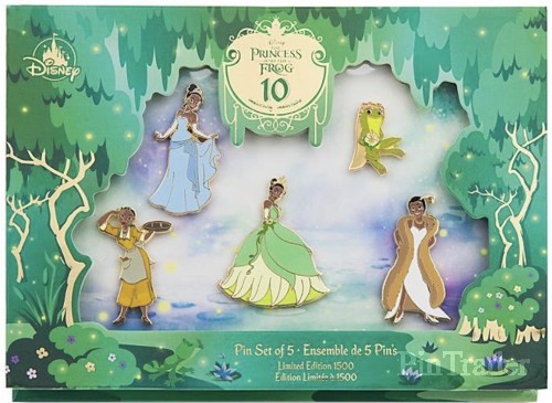 | Description from Shop Disney: Our limited edition pin set celebrating the 10th anniversary of Disney's The Princess and the Frog has all the right ingredients. Tiana, the film's ambitious cook, is featured in a different look for each of the five pins, which come in a commemorative display box. Magic in the details • Limited Edition of 1,500 • Set of five pins includes: Tiana as cook, Tiana in blue dress, Tiana in signature green dress, Tiana in white flapper look, Tiana as bridal frog • Enameled cloisonné • Goldtone finish • Mickey icon pinbacks • Comes in scenic display 10th Anniversary box with magnetic closure • Celebrating the 10th Anniversary of Disney's The Princess and the Frog The bare necessities • Metal / enamel • Pins: up to 1 3/4'' H • Box: 1'' H x 7'' W x 5'' D • Imported Item No. 465053479119 |