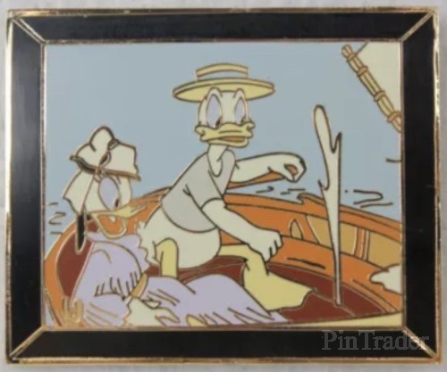 | Donald and Daisy Duck experience an aquatic mishap in this colorful gold-finished collector's pin titled "Boating Ducks." This parody of Edouard Manet's 1874 painting "Boating" is one in a series of "framed" oversize pins that celebrate classic art with a Disney twist. Sold as 25 individual pins and 75 sets. |