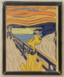 | Set against an expressionistic landscape, Pluto calls out in this colorful gold-finished collector's pin titled "The Howl." This parody of Norwegian artist Edvard Munch's 1893 painting "The Scream" is one in a series of "framed" oversize pins that celebrate classic art with a Disney twist. Sold as 25 individual pins and 75 sets. |