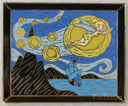 | Tinker Bell soars high above Never Land in this lovely gold-finished collector's pin that pays tribute to Vincent Van Gogh's celebrated 1889 painting "Starry Night," one in a series of "framed" oversize pins that celebrate classic art with a Disney twist. Sold as 25 individual pins and 75 sets. |
