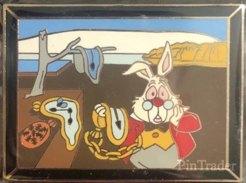 | Ordinarily frantic about being late, here White Rabbit frets over a limp pocket watch in this clever gold-finished collector's pin that parodies surrealist Salvador Dali's 1931 painting "The Persistence of Memory." It's one in a series of "framed" oversize pins that celebrate classic art with a Disney twist. Sold as 25 individual pins and 75 sets. |