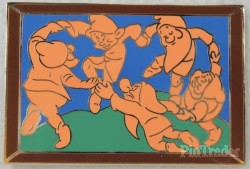 | Five of the Seven Dwarfs form a celebratory circle on this colorful gold-finished collector's pin that pays tribute to Henri Matisse's vivid 1910 oil painting "Dance," one in a series of "framed" oversize pins that celebrate classic art with a Disney twist. Sold as 25 individual pins and 75 sets. |