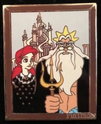 | Ariel and the trident-wielding King Triton stand in for the sober Midwestern farm couple of Grant Wood's celebrated 1930 oil painting "American Gothic" on this distinctive gold-finished collector's pin. |