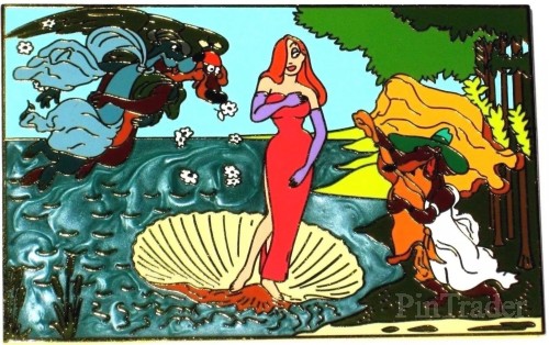 | The Venus of Toontown emerges from her shell for our Masterpiece Series Jessica Pin. Ms. Rabbit gets ready to step out with her admirers, the Toon Patrol Weasels, on this whimsical twist on a masterpiece for your Disney pin gallery. Based on Sandro Botticelli's painting 'Birth of Venus'. |