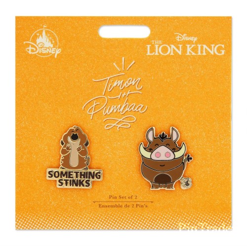 | Description from Shop Disney: Item No. 6505036284599P Celebrate the most memorable duos ever brought to the screen with our collection of Disney Duos enamel pin sets. Featuring Timon and Pumbaa from The Lion King, these pins will inspire you to make your real life friendships just as dynamic as theirs! Magic in the details • Set of two enameled cloisonne pins • Includes Timon and Pumbaa from The Lion King • Timon: ''Something Stinks'' • Goldtone finish • Mickey icon pinbacks • Comes on card • Part of the Disney Duos Collection The bare necessities • Metal / enamel • Timon: 1 1/4'' H x 1'' L • Pumbaa: 1 1/4'' H x 1'' L • Imported |