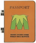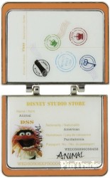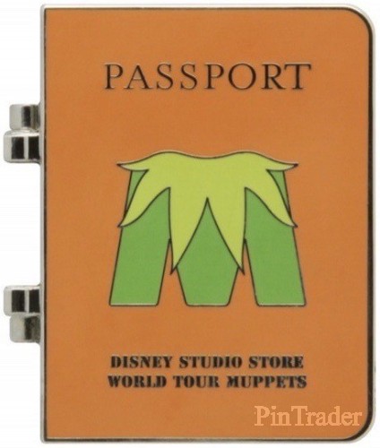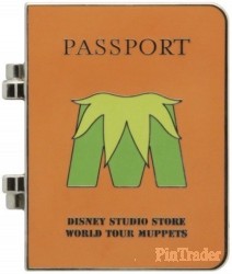 | The inside features a photo of the character with their name, nationality, place of residence and a passport number on the lower portion, and some visa stamps for Madrid, London (twice), Berlin Germany and 'Muppets World Tour' on the upper portion. This pin features Animal, and has a orange color theme. Released at the Disney Soda Store Hollywood for the theatrical release of Disney's Muppets Most Wanted, this is part of a series of 5 pins featuring passports of the main characters in the movie. They are hinged pins with the Muppets 'M' logo on the out side and the word Passport above it, and 'Disney Studio Store World Tour Muppets' underneath it. The same serial number (P389-7448-2-14042) is etched on the back of each pin in the set. |