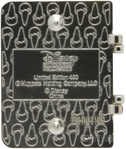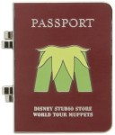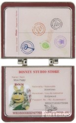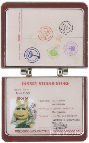 | The inside features a photo of the character with their name, nationality, place of residence and a passport number on the lower portion, and some visa stamps for Madrid, Dublin, London, Moscow and 'Muppets World Tour' on the upper portion. This pin features Miss Piggy, and has a red/pink color theme. Released at the Disney Soda Store Hollywood for the theatrical release of Disney's Muppets Most Wanted, this is part of a series of 5 pins featuring passports of the main characters in the movie. They are hinged pins with the Muppets 'M' logo on the out side and the word Passport above it, and 'Disney Studio Store World Tour Muppets' underneath it. The same serial number (P389-7448-2-14042) is etched on the back of each pin in the set. |