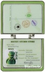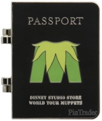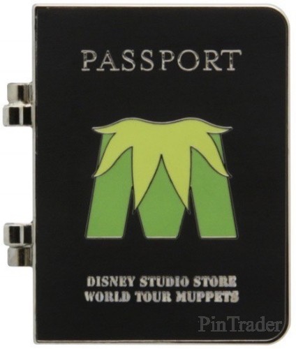 | The inside features a photo of the character with their name, nationality, place of residence and a passport number on the lower portion, and some visa stamps for Dublin, London, Berlin Germany and 'Muppets World Tour' on the upper portion. This pin features Kermit the Frog, and has a green color theme (with a black outer cover since the 'M' logo is green). Released at the Disney Soda Store Hollywood for the theatrical release of Disney's Muppets Most Wanted, this is part of a series of 5 pins featuring passports of the main characters in the movie. They are hinged pins with the Muppets 'M' logo on the out side and the word Passport above it, and 'Disney Studio Store World Tour Muppets' underneath it. The same serial number (P389-7448-2-14042) is etched on the back of each pin in the set. |
