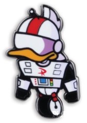 | Description from mondoshop.com: • 1.44" high hard enamel pin designed by Chris Lee. • Single post on black nickel with a rubber clutch backing. |