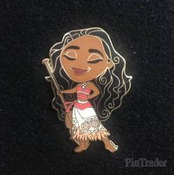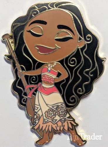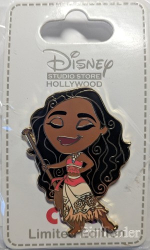 | Pin listing for Moana, Hero, Cuties pin release at Disney Studio Store Hollywood (DSSH). Moana is pictured as an adult. She stands with her left hand on hip. In her right hand she holds an oar/paddle. Her long brown hair is flowing down her back. She wears the heart of Te Fiti, halter top and wrap skirt (in orange/red, tan and cream). Sold on special backing card themed for 'Cuties'. Back: - DSSH waffle pattern - Box with DSSH logo, LE size, copyright Disney - FAC # - One pin post - Two nubs |