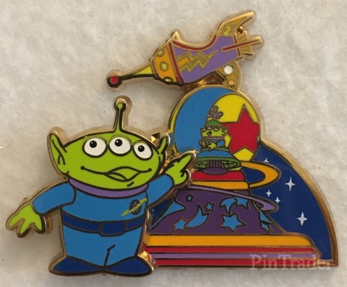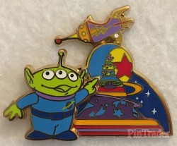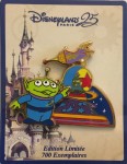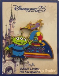 | This pin commemorates the 25th Anniversary of Disneyland Paris and features the green alien, Little Green Men, from Toy Story beside his float from the new parade "Disney Stars on Parade". Logo Pin Trading 2017 and Disneyland Paris 25th anniversary in back. |